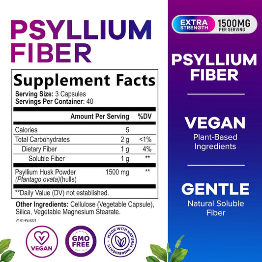 1500mg Psyllium Husk Powder Capsules - Non-GMO Fiber Supplement for Digestive Health & Regularity Support - Vegan & Sugar Free - 120 Count