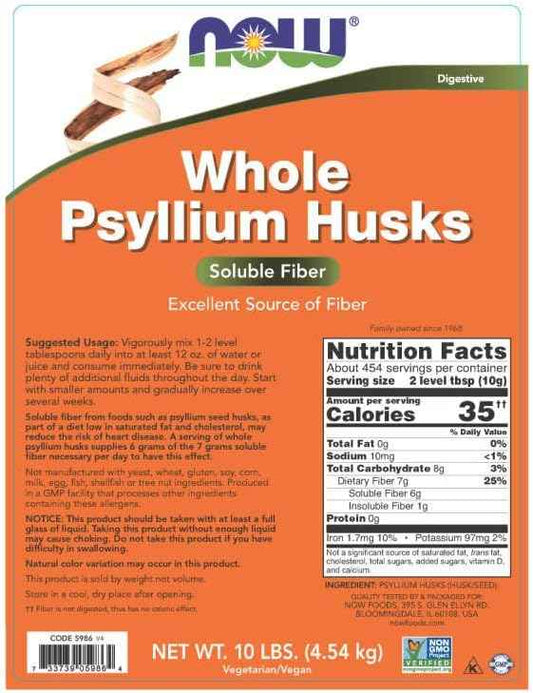 NOW Foods Whole Psyllium Husks Supplements - Non-GMO Verified Soluble Fiber - 10 lbs