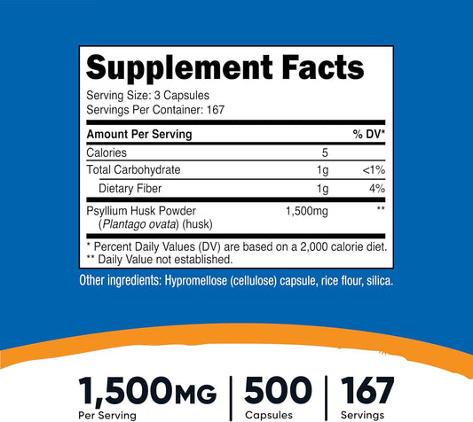 1500mg Psyllium Husk Capsules - 500 Count, Non-GMO & Gluten Free by Nutricost