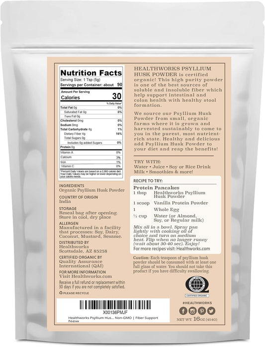 16oz Healthworks Psyllium Husk Powder - Raw Organic Fiber Supplement from India - Keto & Vegan Friendly - Non-GMO Support