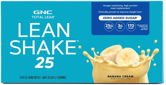 GNC Lean Shake 25 Ready to Drink Protein Shake - Banana Cream Flavor - 12 Bottles with 25g High Protein and Vitamins