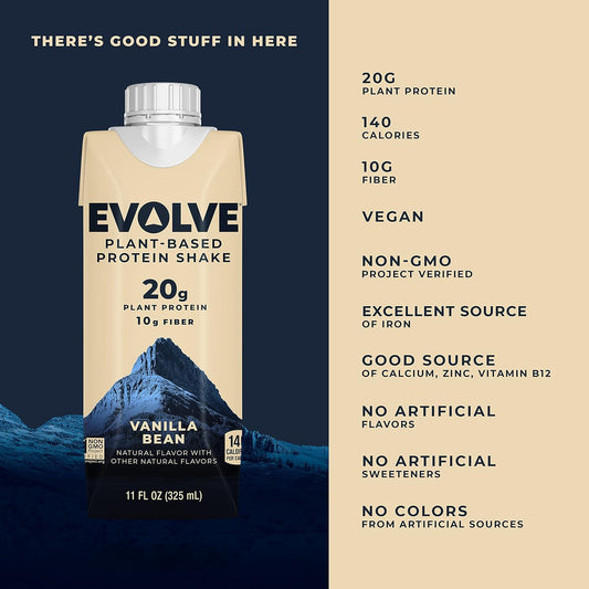 Plant-Based Protein Shake, Vanilla Bean Flavor, 20g Vegan Protein, Dairy-Free, No Artificial Sweeteners, Non-GMO, 10g Fiber, 11 Fl Oz (Pack of 12) - Evolve