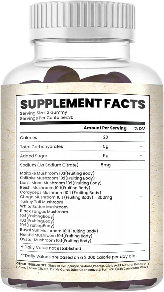 10 in 1 Magic Mushroom Gummies - Raspberry Flavor, Mushroom Complex with Lions Mane, Reishi, Chaga, Cordyceps, Maitake Mushroom for Cognitive Function, Immune Health, Energy - 1 Bottle