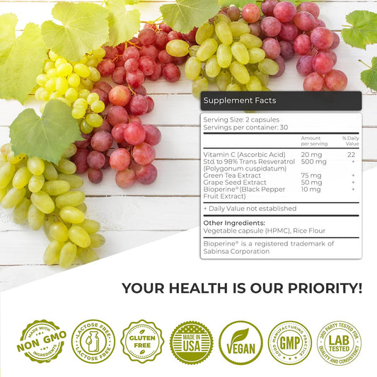 Nutrica Life Trans Resveratrol Supplement 500mg with Bioperine - Anti Aging & Heart Health Antioxidant - Brain Booster - 60 Vegan Capsules