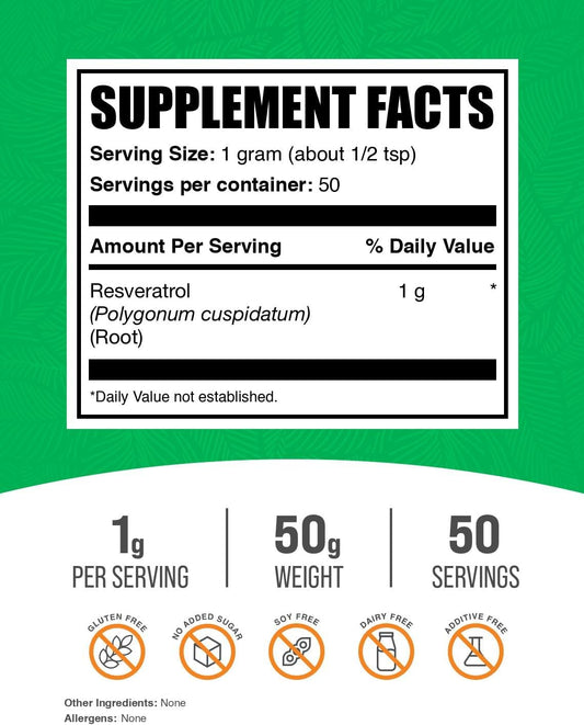 Resveratrol Powder Supplement - 1000mg per Serving - Antioxidant & Gluten Free - Polygonum Cuspidatum Extract - 50g (1.8 oz) - Bulk Resveratrol Powder for Health - Pack of 1