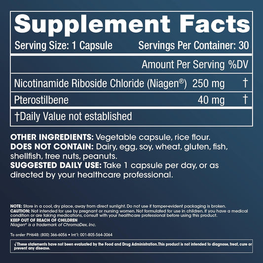 ProHealth NR + Pterostilbene Capsules for Longevity, Energy, Heart & Brain Health - 250mg Niagen + 40mg Pterostilbene, 30 Count