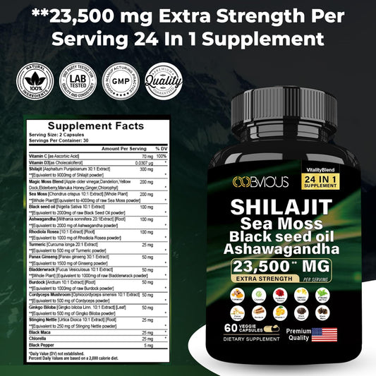 24-in-1 Himalayan Shilajit Capsules with Black Seed Oil, Rhodiola Rosea, Panax Ginseng, Sea Moss, Ginkgo Biloba, and More - 60 Capsules, 30-Day Supply