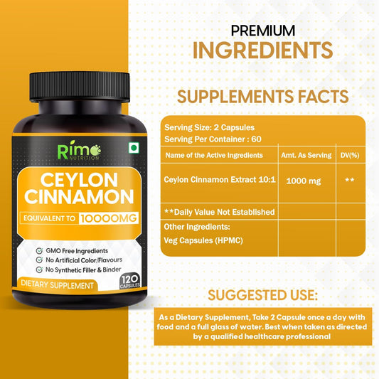 Ceylon Cinnamon Capsules 1000mg - 120 Capsules, Gluten Free, Non-GMO, Pure Ceylon Cinnamon Supplement by Rimo Nutrition