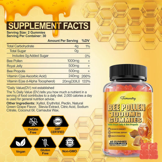 Sugar-Free Bee Pollen Gummies with Royal Jelly & Propolis, Vitamin C & E, Vegetarian, Non-GMO (120 Count)