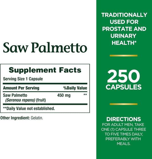 Saw Palmetto Herbal Supplement for Prostate & Urinary Health - 450mg, 250 Capsules by Nature's Bounty