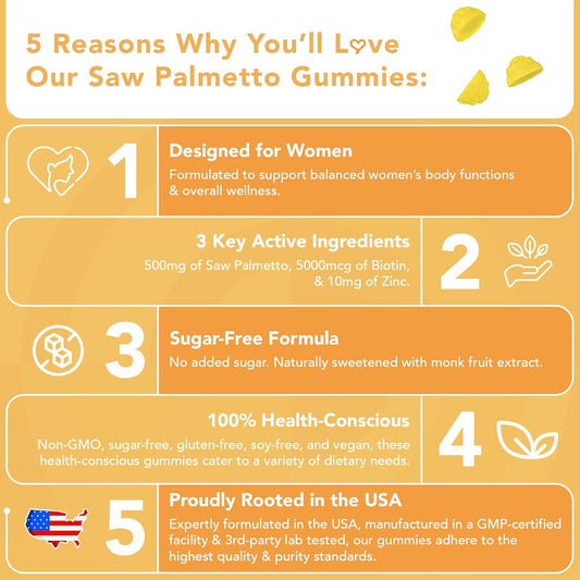 Saw Palmetto Gummies for Women with Biotin & Zinc - Non-GMO, Vegan, 3rd-Party Lab Tested - 30-Day Supply, 60 Chewable Gummies