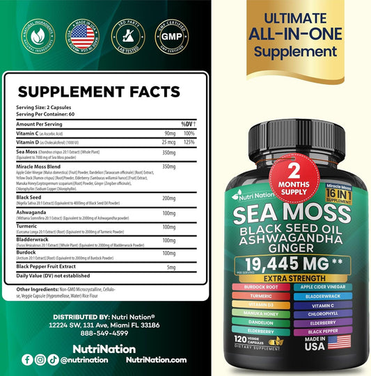 16-in-1 Nutrient-Rich Supplement with Sea Moss, Black Seed Oil, Ashwagandha, Turmeric, and More (120 Capsules)