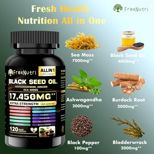 120 Count FrexNutri Multimineral Supplement with Sea Moss, Black Seed Oil, Ashwagandha, Bladderwrack, Burdock Root, Apple Cider, Yellow Dock, Manuka Honey, Ginger, and Black Pepper