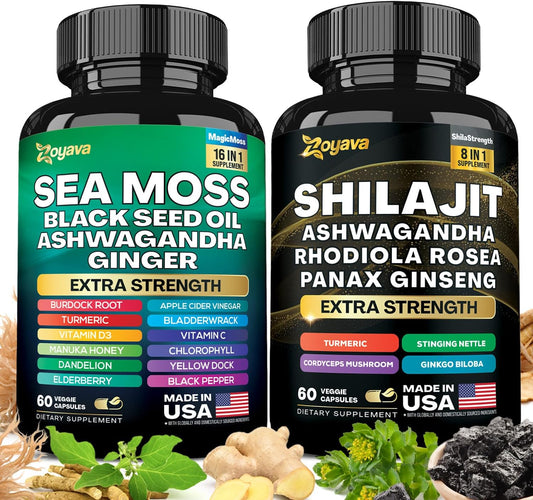 Dynamic Vitality Bundle - Sea Moss, Black Seed Oil, Ashwagandha, Ginger, Shilajit, Rhodiola Rosea, Panax Ginseng - 1 Month Supply of All-in-1 Supplements