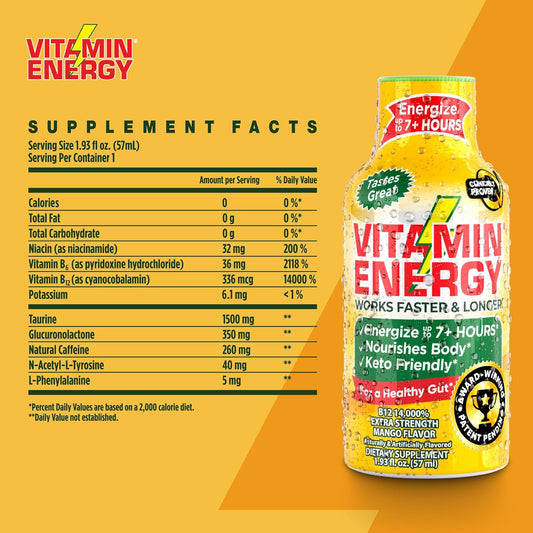Mango Flavored Vitamin B12 Energy Shots - Sugar-Free and Carb-Free Supplement for 7+ Hours of Natural Energy and Focus - Pack of 48 Shots