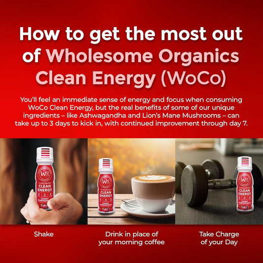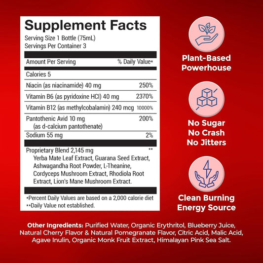 Organic Energy Shot with Yerba Mate, Ashwagandha, Lion's Mane & B12 - Cherry Pomegranate Flavor - 3 Pack of 2.5 FL Oz Shots