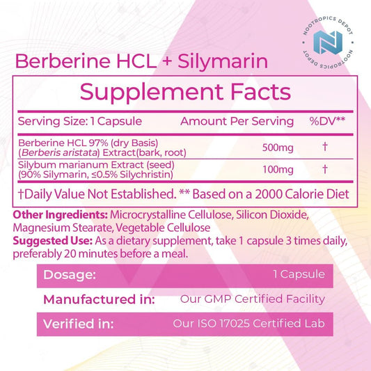 Berberine HCL + Silymarin Capsules 500mg + 90mg | 60 Count | Supports Cellular & Metabolic Function | Nootropics Depot