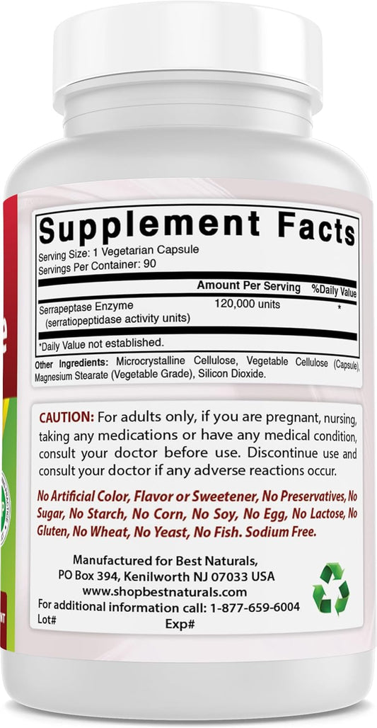 Natural Serrapeptase Supplement - 120000 SPUs, 90 Capsules for Sinus Health - Vegetarian Formula for Wellness