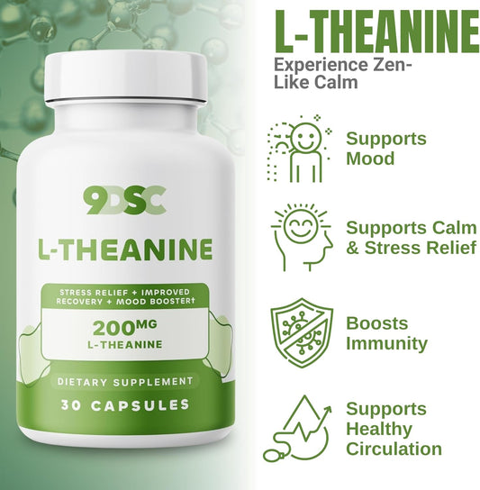 Premium 9DSC L-Theanine Supplement 200mg - 30 Capsules - Double Strength Formula for Relaxation and Sleep Aid - USA Made