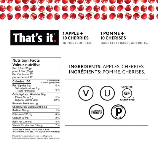Apples + Cherry Fruit Bar: High Fiber Vegan Snack, Gluten-Free, Paleo, Non-GMO, Sugar-Free Energy Food - 12 Count Pack
