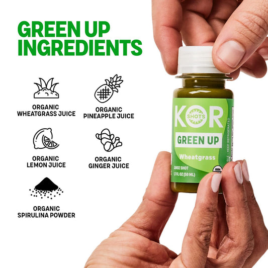 18 Pack Kor Shot Green Up Shot with Wheatgrass, Ginger, and Spirulina - 1.7 Fl Oz Daily Greens Superfoods Shot - USDA Certified Organic