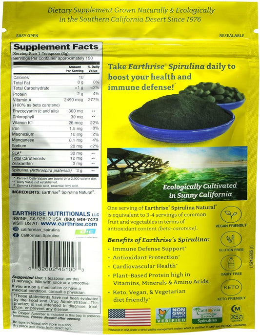 Earthrise Spirulina Natural Powder 16oz - Premium California-Grown Vegan Superfood - Gluten Free, Keto Friendly, Non-GMO - Rich in Vitamins & Minerals - 1 LB Pack