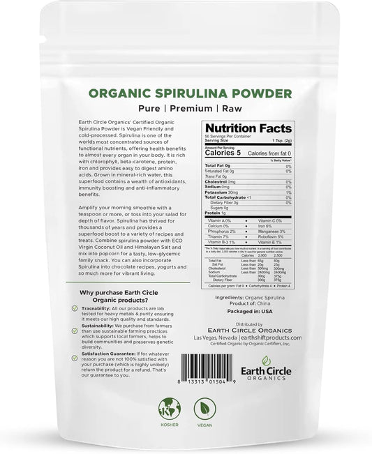 Earth Circle Organics Spirulina Powder - Kosher, Raw & Non-Irradiated | Pure Vegan Protein | Premium Superfood Rich in Amino Acids & Antioxidants - 12 Ounces (3 Pack)
