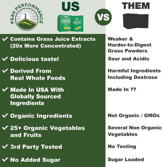 Organic Greens Superfood Powder Single Serve Packets for Peak Performance - 25+ All Natural Ingredients for Max Energy - 20 Pack