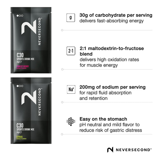 Neversecond C30 Sports Drink Variety Pack - High Performance Electrolyte Hydration & Carbohydrates for Triathlons, Cycling, Ironman & Marathons - 6 Single Servings
