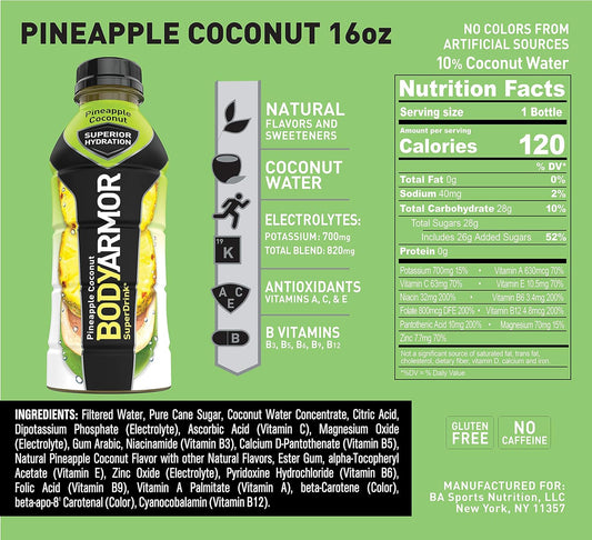 BODYARMOR Pineapple Coconut Sports Drink - Natural Flavors, Vitamins, Electrolytes - No Preservatives - 16 Fl Oz - Ideal for Athletes