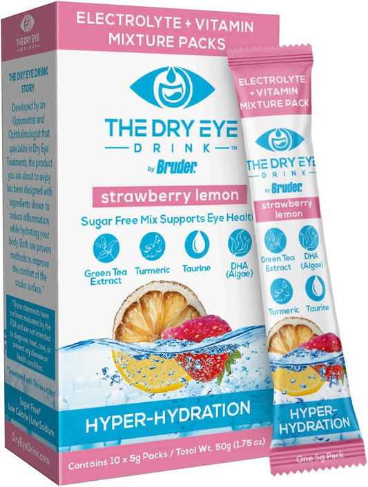 Sugar-Free Electrolyte Powder Packets for Dry Eyes l Hydrating Blend of Vitamins, Green Tea, Turmeric l 5g x 10 Packets (Strawberry Lemon)