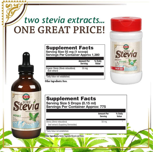 Sure Stevia Bundle: Liquid Extract 4oz (775 Servings) & Powder 2.8oz (1,380 Servings) - Zero Calorie, Low Glycemic Formula
