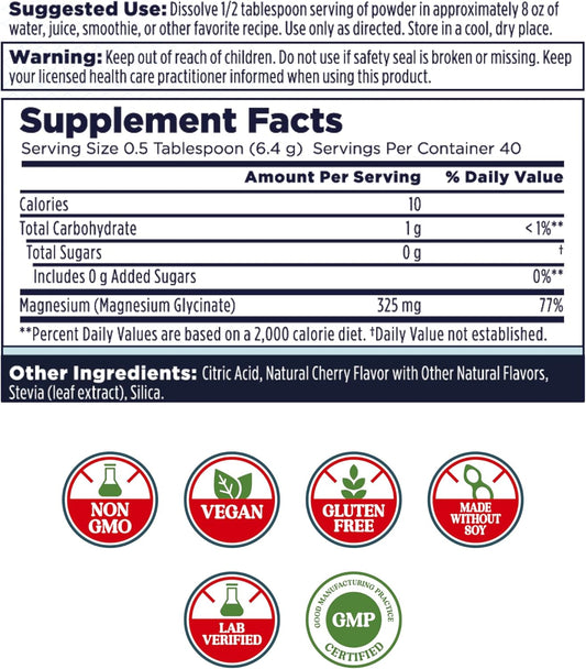 Cherry Flavored KAL Calming Magnesium Powder - High Absorption Supplement for Relaxation Support - Vegan, Gluten Free, No Added Sugar - 40 Servings, 9 oz