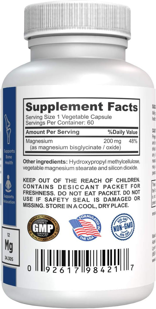 AlcheVita Magnesium BisGlycinate Capsules - 200mg Essential Mineral for Relaxation, Muscle Cramps, Bone Health, Tension, Stress Relief - Easy Digestion Formula - 60 Count