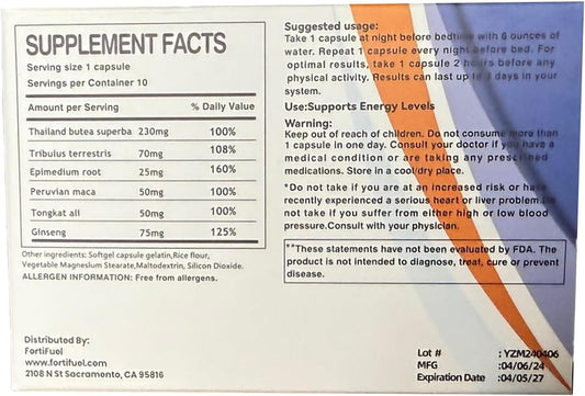 Fortifuel Male Sports Performance Nutritional Support Supplements - 10 Pack, Made in USA