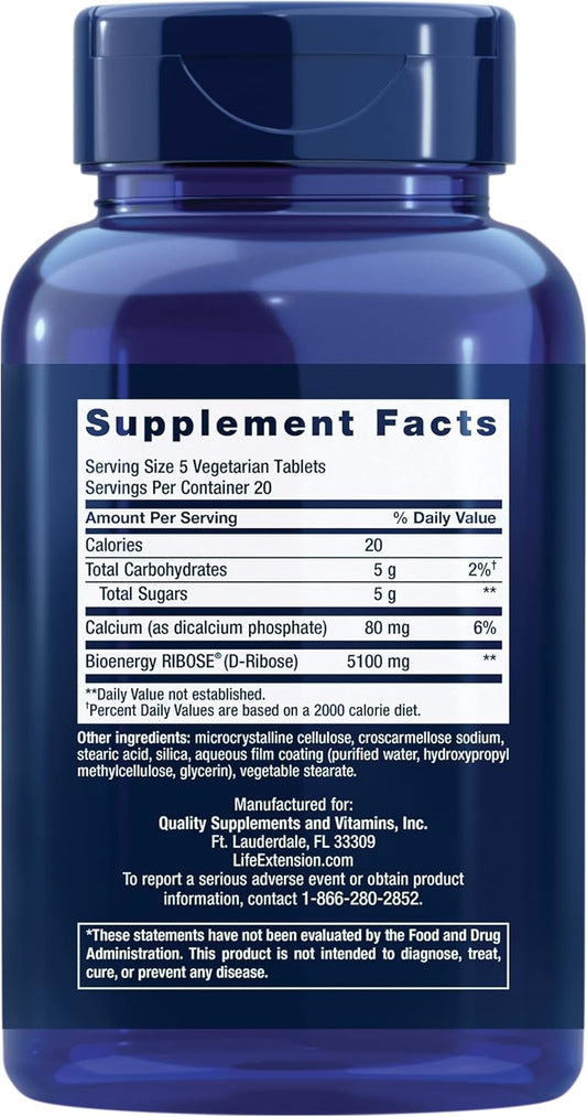 Vegan D-Ribose Tablets with Calcium for Energy Support and ATP Production - 100 Vegetarian Tablets, Gluten-Free and Non-GMO