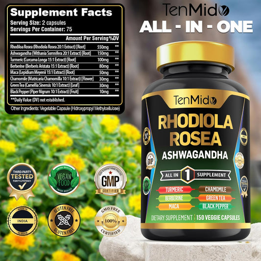 Rhodiola Rosea 8in1 Supplement with Ashwagandha, Turmeric, Berberine, Maca, Chamomile, Green Tea, Black Pepper - 150 Vegan Capsules