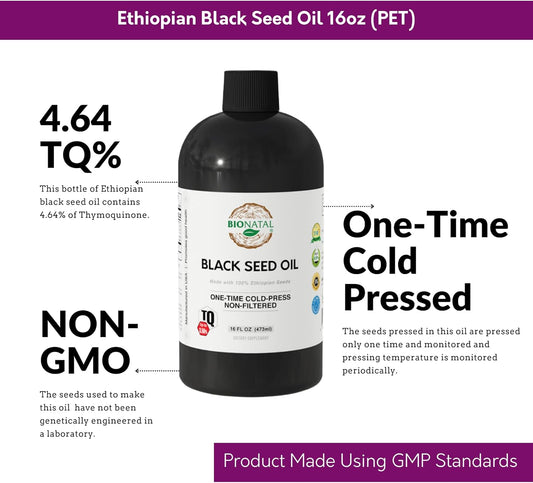 16oz BioNatal Ethiopian Black Seed Oil with Up to 4.64% Thymoquinone - Pure Nigella Sativa Seeds - Non-Filtered Cold-Pressed Black Cumin Seed Oil
