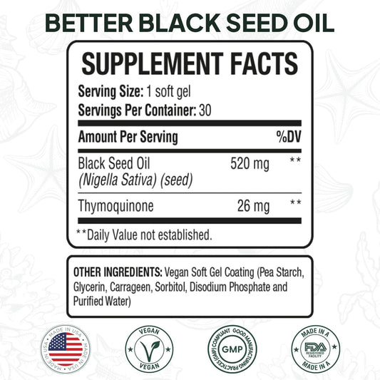 Cold Pressed Black Seed Oil Softgels - Immunity & Cognitive Health Support - 2% Thymoquinone - 60 Capsules - USA Made
