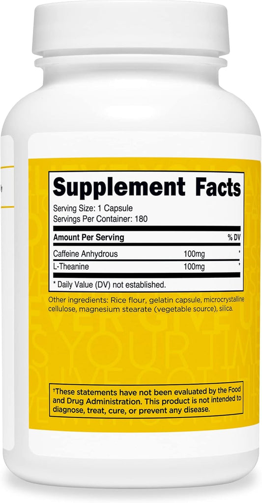 180 Capsules of TransformHQ Caffeine & L-Theanine (100mg Each) - Gluten Free, Non-GMO Formula for Energy and Focus