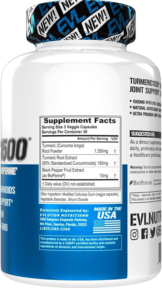EVL Turmeric Curcumin with Bioperine 1500mg - 95% Curcuminoids, Black Pepper for Digestive, Skin, Immunity, Liver, Joint Support - Non-GMO Vegan Supplement
