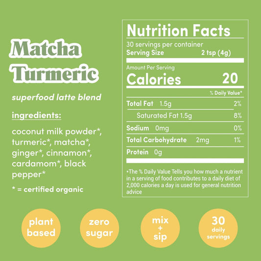 Plant-Based Superfood Latte Blend with Matcha Turmeric - Anti-Inflammatory for Skin, Gut Health, & Stress Balance - 30 Servings