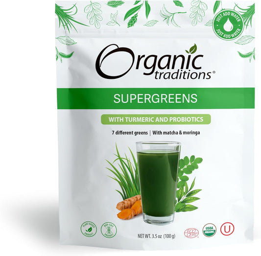 Organic Super Greens Powder with Turmeric & Organic Greens - 100g/3.5oz Bag - Superfood Blend