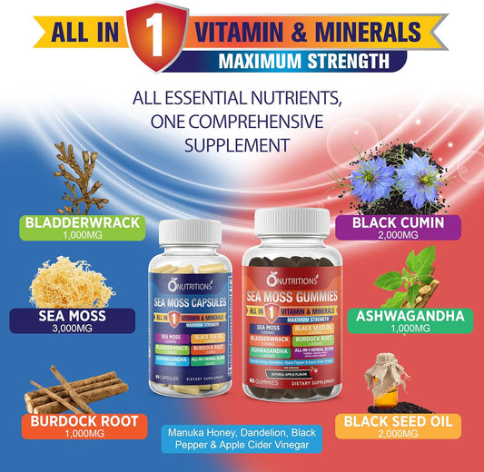 Sea Moss Supplement with Black Seed Oil, Ashwagandha, Turmeric, and More - 3000mg Sea Moss, 2000mg Black Seed Oil, 1000mg Ashwagandha - O NUTRITIONS All-in-1