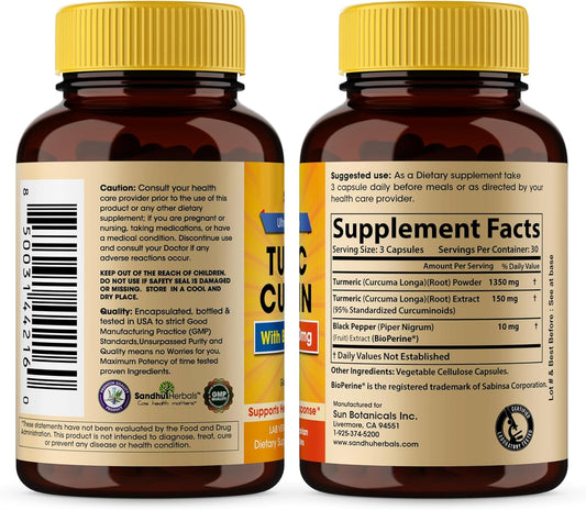Sandhu Herbals Turmeric Curcumin Supplement - 90 Capsules, 1500mg with 95% Curcuminoids for Immune & Joint Support - Made in USA