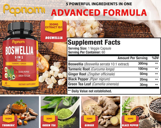 Organic Boswellia Serrata Extract Capsules with Turmeric, Ginger, Black Pepper & Green Tea - 60 Vegan Capsules for 2 Months - Herbal Wellness Supplement