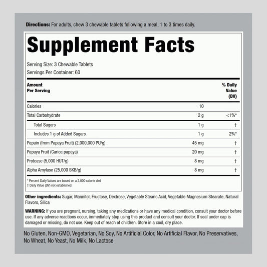 Chewable Papaya Enzymes Tablets - 180 Count - Vegetarian Digestive Supplement - Non-GMO & Gluten-Free - Tropical Flavored