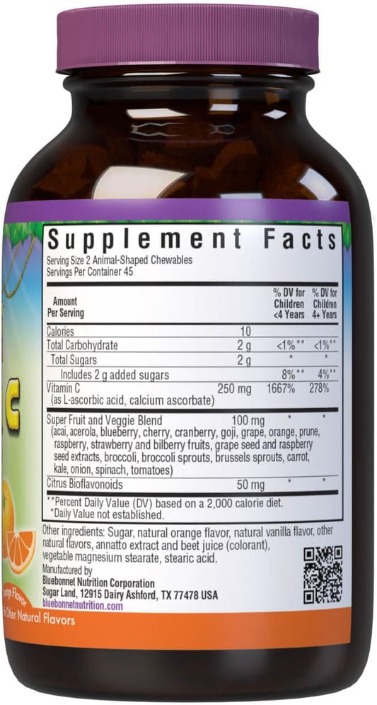 Bluebonnet Nutrition Rainforest Animalz Vitamin C Chewable Tablets - 90 Tablets, 250mg, Soy-Free, Gluten-Free, Dairy-Free, Vegan - Orange Flavor - Kosher Certified - 45 Servings