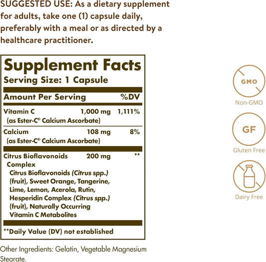 Solgar Ester-C Plus 1000mg Vitamin C Capsules with Citrus Bioflavonoids - Gentle 24-Hour Immune Support for Upper Respiratory Health - Non-GMO, Gluten Free - 50 Servings