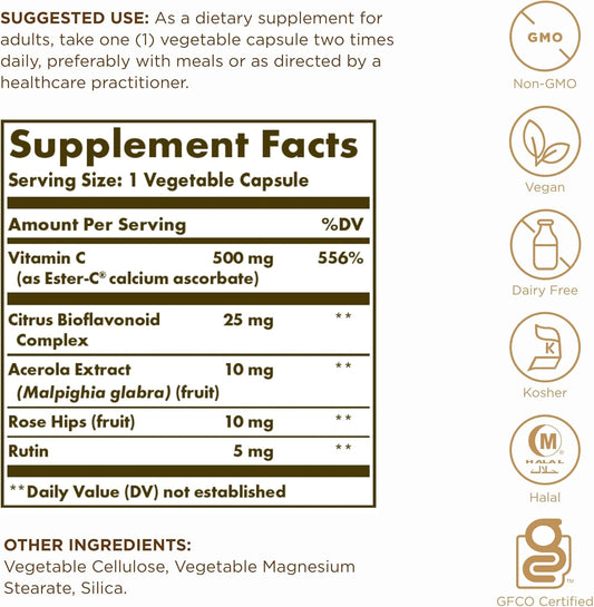 Solgar Ester-C Plus 500mg Vitamin C Capsules - 200 Servings, 100 Capsules Each - Immune Support & Antioxidant - Non-GMO, Vegan, Gluten-Free, Kosher